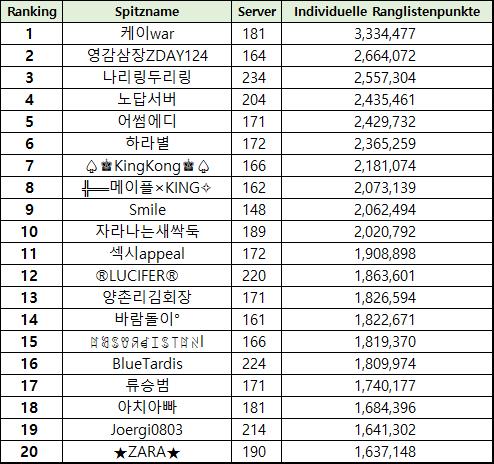 ※ Bonus-Punkte für den siegreichen Server: 30.000.000 (fest)