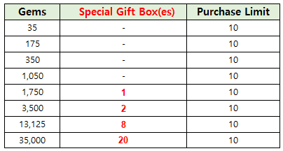 - Gem Festa Packages of 1,750 Gems or more include one or several Special Gift Box(es) granted to the purchaser.