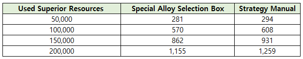 • Advanced Special Alloy and Special Alloy Selection Boxes will be distributed based on the amount of Superior Resources used during the eligible period.