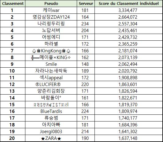 ■ TOP 20 du score total du classement individuel pour la 3e session de la Bataille des serveurs Legends Cup
