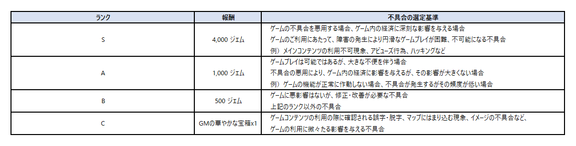 - 内容: 不具合の報告の基準と等級による報酬の支給