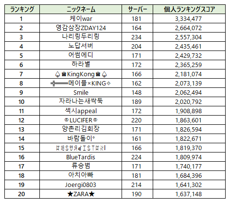 ■ サーバー大戦 Legends Cup 第3戦個人ランキング集計ポイント TOP20