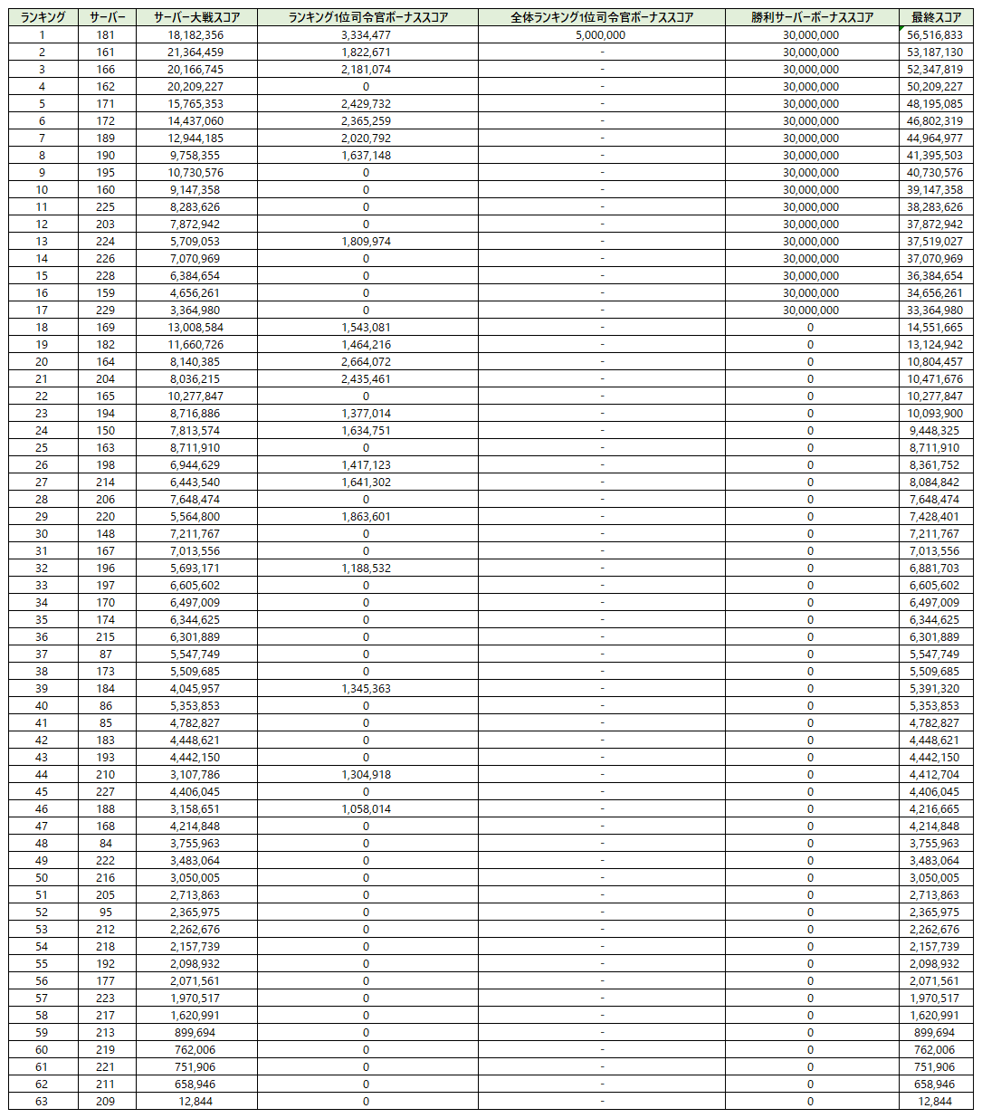 ※ サーバー大戦ポイントは、参戦した司令官の個人ポイントがすべて集計された結果となります。