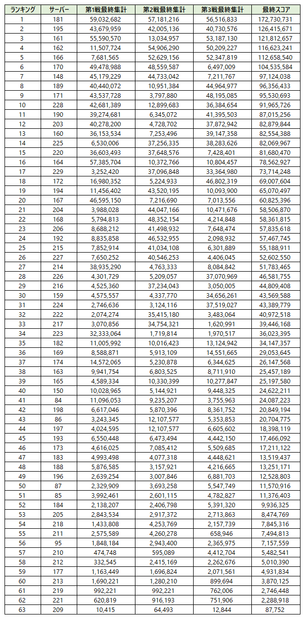 ■ サーバー大戦 Legends Cup 第1戦、第2戦、第3戦の最終合計ポイント(最終結果)