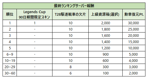 ※サーバー大戦 Legends Cup 最終ランキングサーバー報酬は、対象者の取りまとめが完了次第、後日配布予定です。