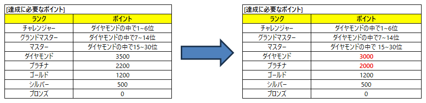 2) 陣地攻防戦のダイヤモンド / プラチナ達成ポイントおよびシーズン終了後のランク別適用ポイントの変更