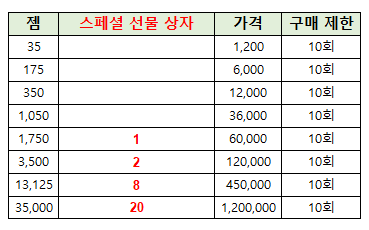 ※ 1,750젬 이상의 젬 페스타 상품은 구매자에게 지급되는 '스페셜 선물 상자'를 포함하고 있습니다.