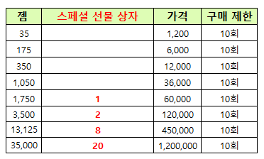 ※ 1,750젬 이상의 젬 페스타 상품은 구매자에게 지급되는 '스페셜 선물 상자'를 포함하고 있습니다.