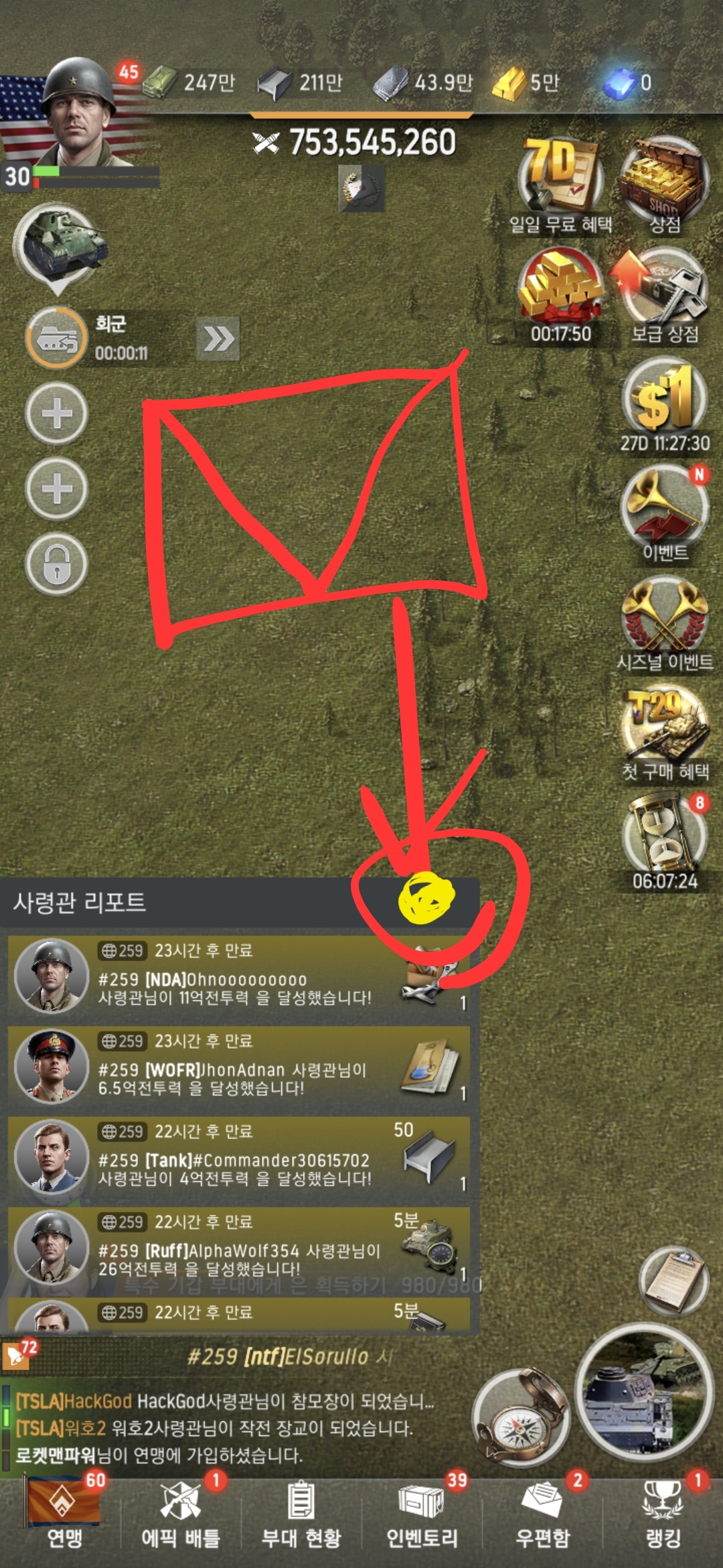 첨부한 이미지 파일에 사령관 리포트 알림 영역에 노란색으로 마킹한 부분에