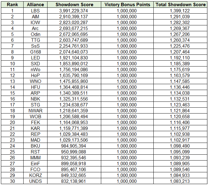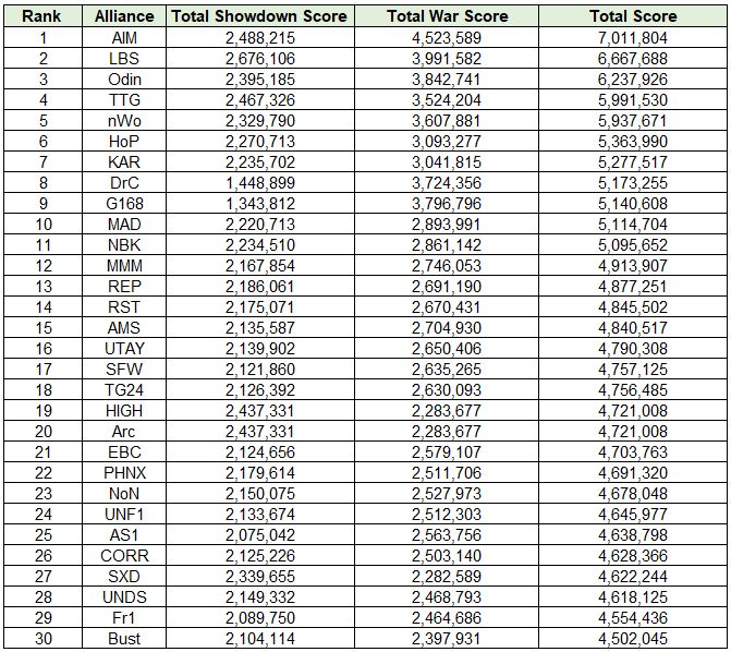 ■ Alliance Wars: Challenge Cup – Round 2 TOP 30 (Alliance Showdown Score + Alliance Wars Score)