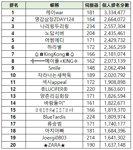 ■ 伺服大戰 Legends Cup 傳奇盃第三回合:個人排名合計分數前20名