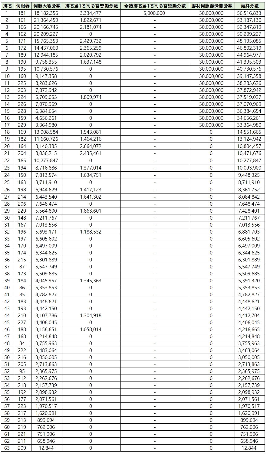 ※ 伺服大戰分數為所有參戰司令官的個人分數總和。