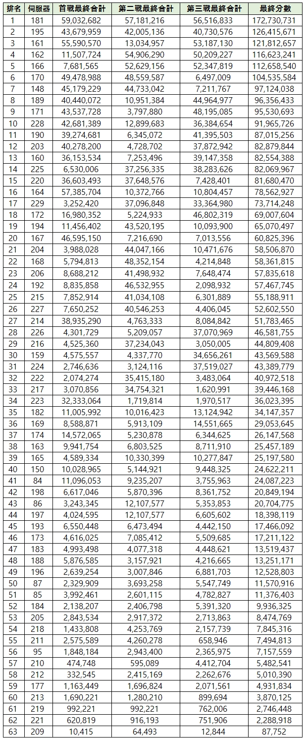 ■ 伺服大戰 Legends Cup 傳奇盃第一、二、三回合:合計最終分數 (最終結果)