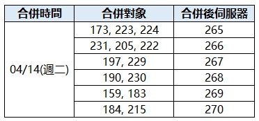 ※ 合併對象伺服器:159, 173, 183, 184, 190, 197, 205 ,215, 222, 223, 224, 229, 230, 231
